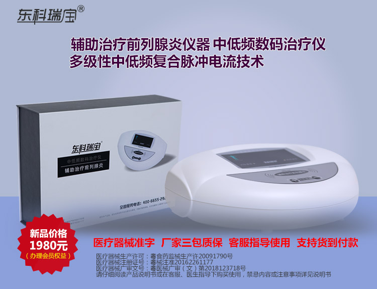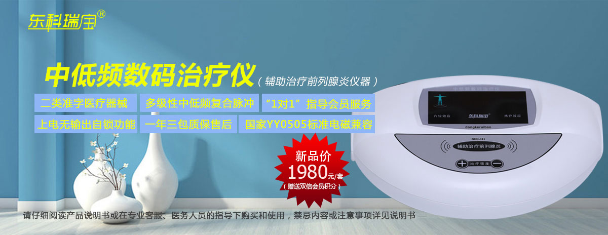東科瑞寶牌中低頻數(shù)碼治療儀(輔助治療前列腺炎)采用多級性中低頻復(fù)合脈沖電流,根據(jù)前 列腺疾病治療的特性,由專門設(shè)計的電腦程序控制中頻脈沖電流3000Hz-至低頻脈沖電流370Hz之 間不斷變頻轉(zhuǎn)換,利用專用理療電極片等配件耗材輸出,并通過特定穴位經(jīng)絡(luò)釋放,起到輔助治療 前列腺炎等疾病的作用。 東科瑞寶品牌治療儀器使用220v交流電源,符合國家YY0505標(biāo)準(zhǔn)電磁兼容有關(guān)要求,具有耐壓4000 伏和上電無輸出自鎖的安防功能,可適用于家庭、中小醫(yī)療機構(gòu)、鄉(xiāng)鎮(zhèn)醫(yī)院、社區(qū)診所理療科室等。